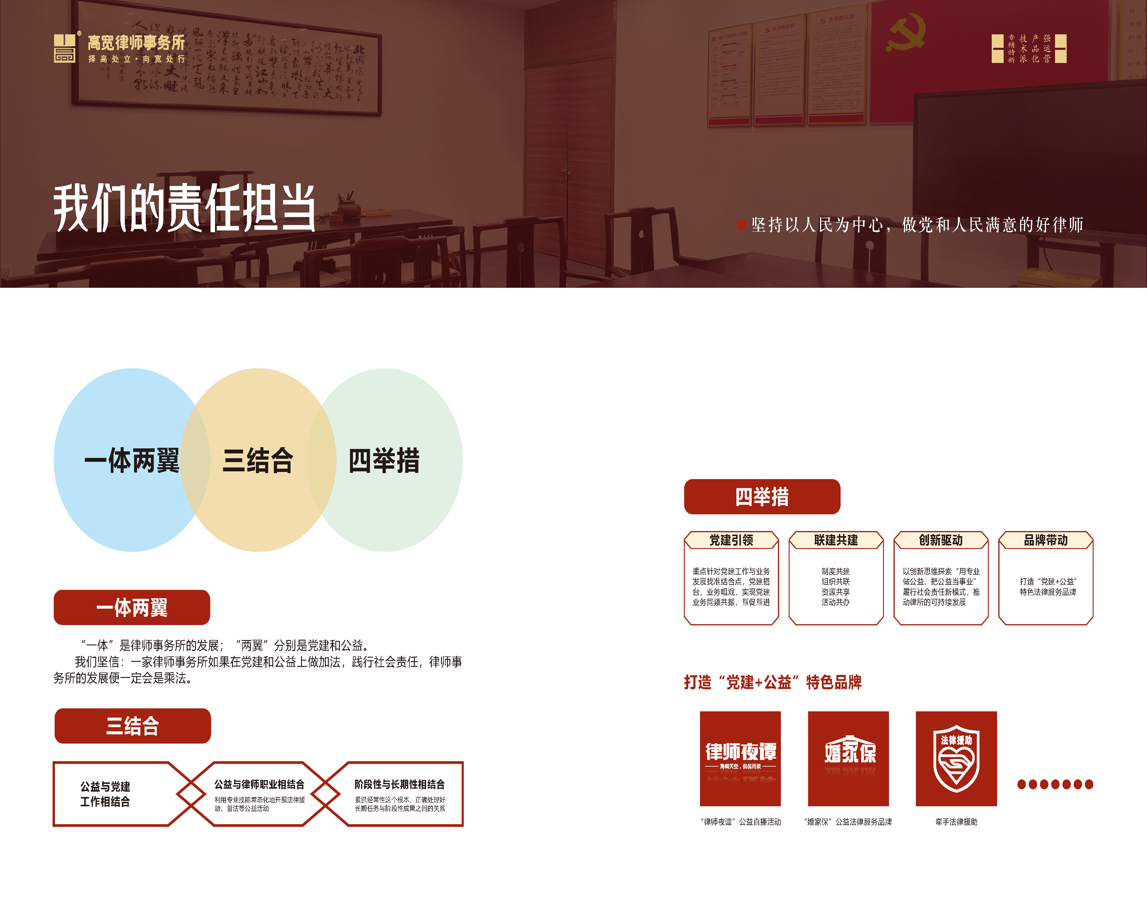 责任是使命的基石,担当是使命的双翼,它伴随着使命的始终。律所可以不伟大,但绝对不可以没有担当,我们将践行“一体两翼三结合四措施”工作思路,党建引领,公益为民,积极履行社会责任,围绕中心,服务大局,为国家法治建设添砖加瓦!